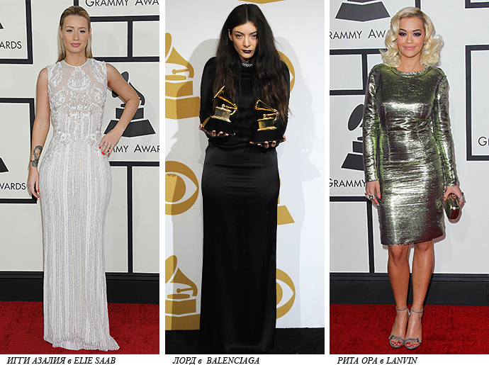 Многие певицы и актрисы предпочли в этом году блестящие и металлизированные наряды: Рита Ора пришла на церемонию в зеленом переливающимся коктейльном платье из весенней коллекции Lanvin, дополнив свой образ множеством массивных колец, разноцветным маникюром и золотым клатчем от Jimmy Choo. Что удивительно, молодая девушка пришла на церемонию в ее излюбленном образе в стиле Монро, но без красной помады.
