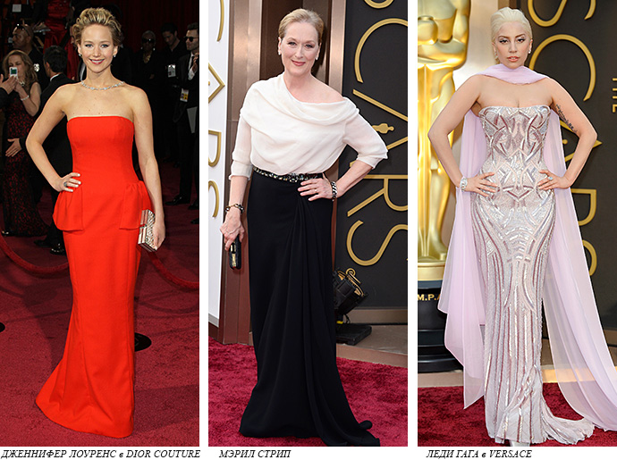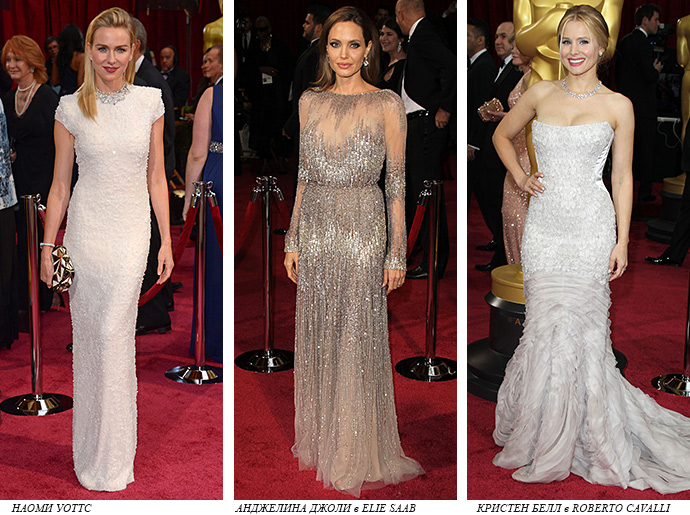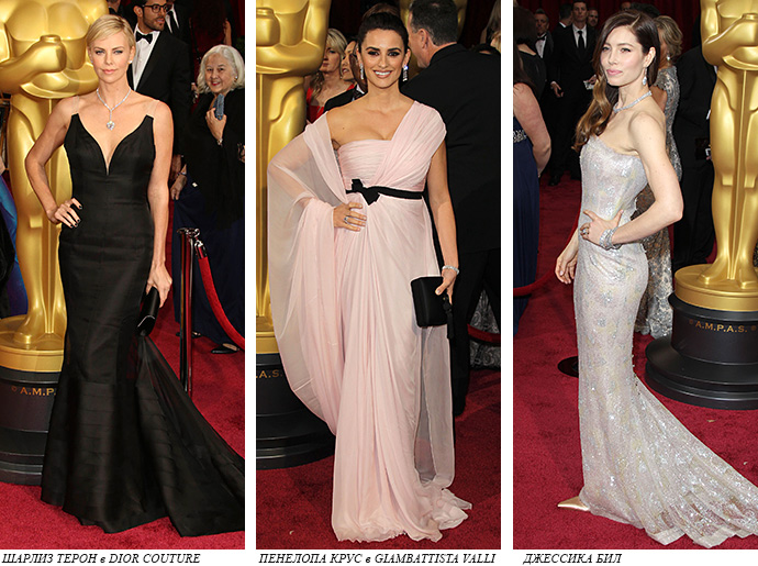 Оливия Уайлд остановилась на монохромном образе, который состоял из шикарного платья Valentino и украшений от Lorraine Schwartz. Один из самых запоминающихся нарядов принадлежал Камиле Альвес, жене Мэтью МакКонахи. Ее бледно-розовое платье Gabriela Cadena, асимметричное на одну сторону, смотрелось потрясающе, особенно в движении. Много внимания на красной дорожке отхватило ожерелье Наоми Уоттс от Bvlgary., которое не потерялось даже на фоне ее белого блестящего Calvin Klein Collection. Еще одно интересное украшение – цепочка Дженнифер Лоуренс, которую актриса уже в привычной для себя манере перевесила на спину; и естественно, что молодая и талантливая звезда появилась в платье от Dior, как и Шарлиз Терон.