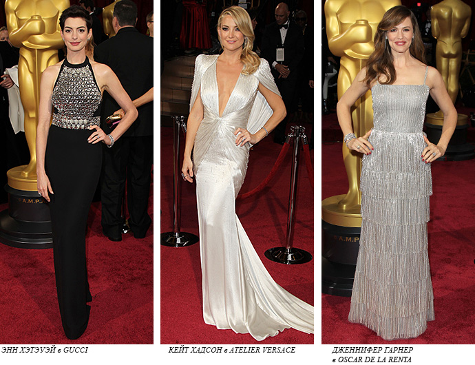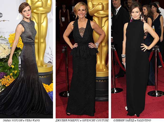 Джулия Робертс отдала предпочтение черному кружевному платью с баской от Givenchy Couture, дополненное украшениями Bvlgari. Сандра Буллок блистала в драпированном темно-синем платье от Alexander McQueen и украшениях от Lorraine Schwartz. Эми Адамс, которую уже окрестили женской версией Ди Каприо, также выбрала глубокий синий оттенок в исполнении Gucci Première и Tiffany & Co. Джессика Билл дополнила украшениямиTiffany & Co платье из весенней кутюрной коллекции Chanel.