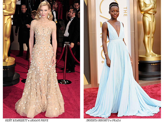 Настоящими триумфаторами стали оскароносные Кейт Бланшетт и Люпита Нионго. Первая появилась на церемонии в великолепном творении от Armani Prive и украшениях Chopard. Безусловно, этот выход Кейт был самым потрясающим! Люпита Нионго, звезда картины-победителя «12 лет рабства», прибыла на «Оскар» словно на бал; в интернете мгновенно появились разнообразные картинки, на которых начинающую, но многообещающую актрису в платье от Prada сравнивают с Золушкой.