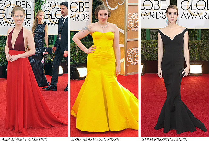 Насыщенными цветами порадовали Лина Данэм в пышном платье от Zac Pozen, Мария Менунос в интересном неоново-розовом платье от Max Azria и Тейлор Свифт в Carolina Herrera, которой так же отдала предпочтение ведущая церемонии Тина Фей.