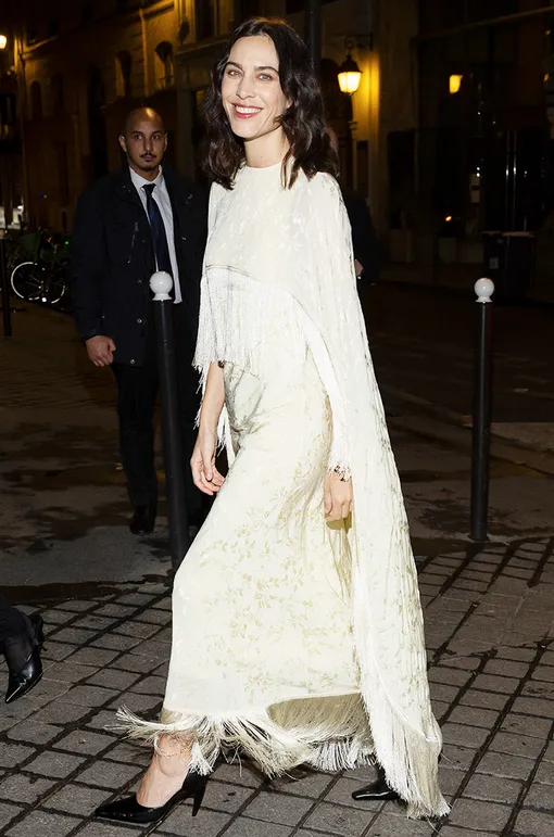 Подхватила тренд Алекса Чанг. Там же в Париже она надела туфли на изогнутом каблуке с отделанном бахромой платьем масляно-желтого цвета.