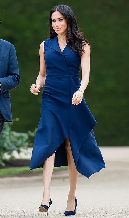 Герцогиня любит необычный крой и асимметрию — с помощью таких небольших хитростей Меган корректирует свою фигуру.