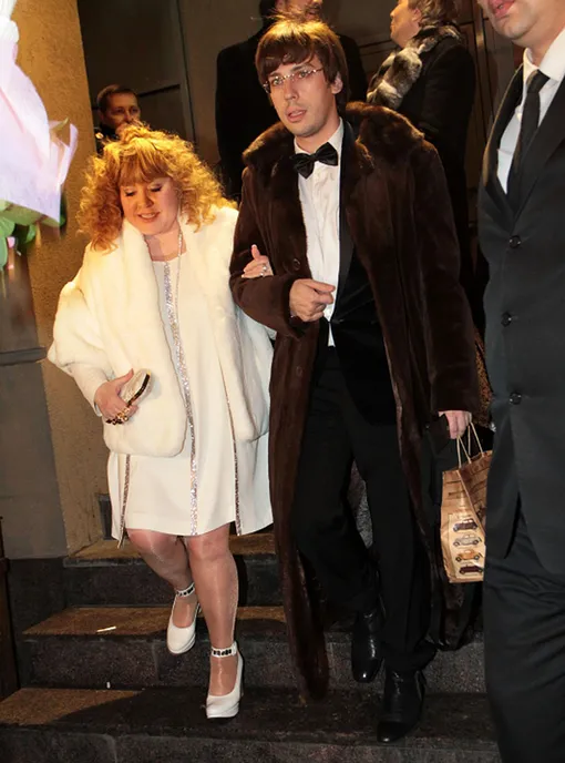 Алое платье в пол, роскошные меха и классические голливудские локоны... Целостность образа Татьяны Навки нарушает лишь неголливудская плитка на полу.