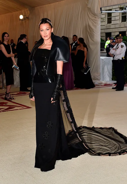 Белла Хадид выбрала для бала total black look — модель появилась в футуристичном черном платье, которое дополнила кожаными перчатками без пальцев и золотыми украшениями в волосах.