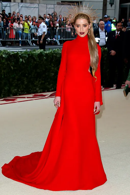 Эффектный образ продемонстрировала Эмбер Херд — экс-супруга Джонни Деппа выбрала минималистичный красный наряд, который дополнила головным убором, напоминающим нимб.