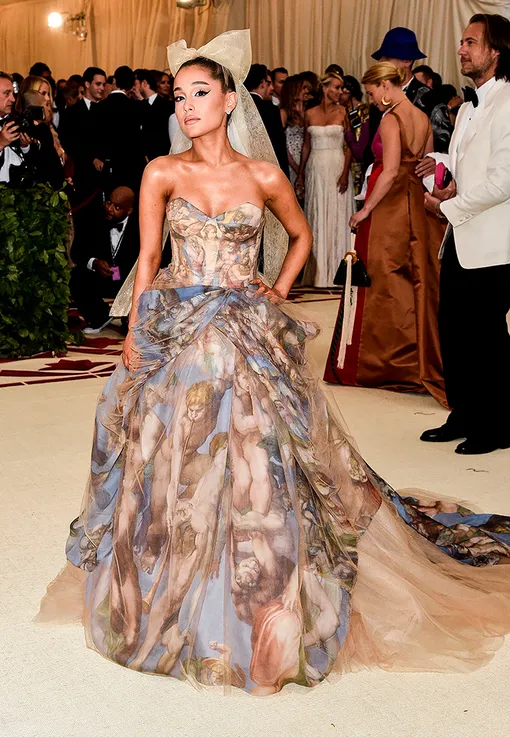 Ариана Гранде также сделала реверанс в пользу тематики Met Gala 2018 — звезда появилась в платье с принтом, повторяющим католические фрески.