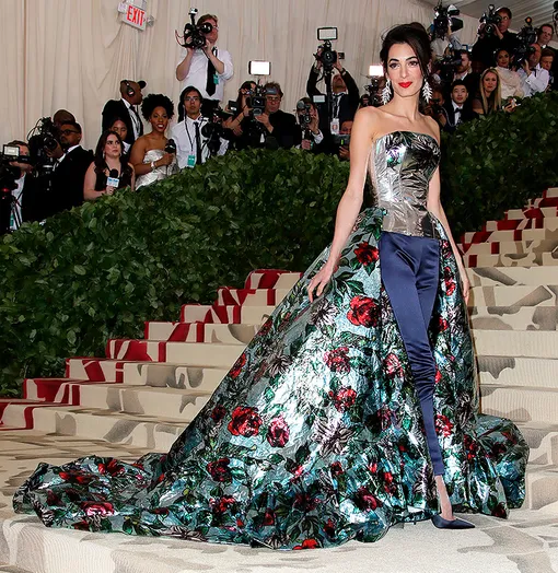 Амаль Клуни, как и некоторые другие гости, решила не одеваться в соответствии с идеей бала — супруга Джорджа Клуни выбрала комбинезон с длинным шлейфом с цветочным принтом.