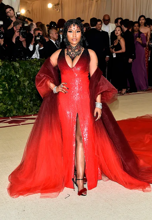 А вот Ники Минаж отдала предпочтение красному платью с внушительным декольте — признаемся честно, образ вышел довольно инфернальным.