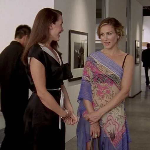 Асимметричное платье Кэрри, в котором она появилась в галерее Шарлотты, также запомнилось всем фанатам «СВБГ».