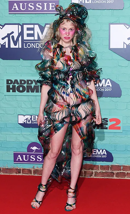 Певица Петит Меллер известна своей любовью к необычной одежде и макияжу, но на церемонии MTV EMA она умудрилась превзойти свои предыдущие выходы — звезды появилась в непонятной «конструкции», напоминающей елочную игрушку, а на лицо щедро нанесла ярко-розовый пигмент.