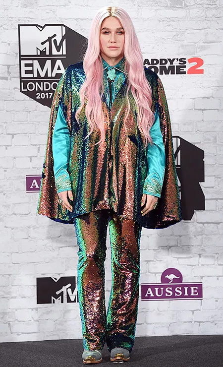 Когда-то Кеша (Ke$ha) удивляла откровенными нарядами, но после того, как певица прибавила в весе, она решила носить максимально закрытые вещи. Впрочем, странноватым фасонам и цветовым сочетания певица по-прежнему верна — вчера, например, она позировала фотографам в сверкающем костюме, больше подходящем для диско-вечеринки.