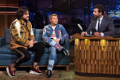 А здесь Николай явно не дотягивает до друга — на контрасте с нарядом Филиппа джинсовый костюм Баскова выглядит скучновато.