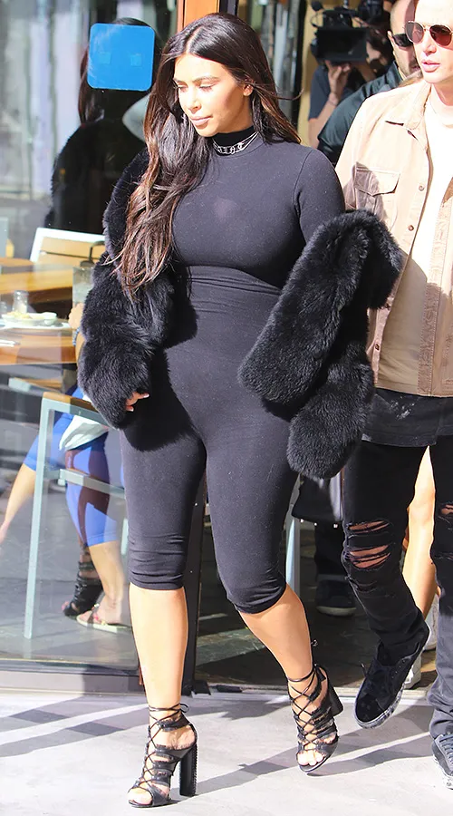 Каблуки, спортивный комбинезон из лайкры и небрежно наброшенный полушубок — интересно, куда Ким ходила в таком эклектичном образе? На йогу для модниц?