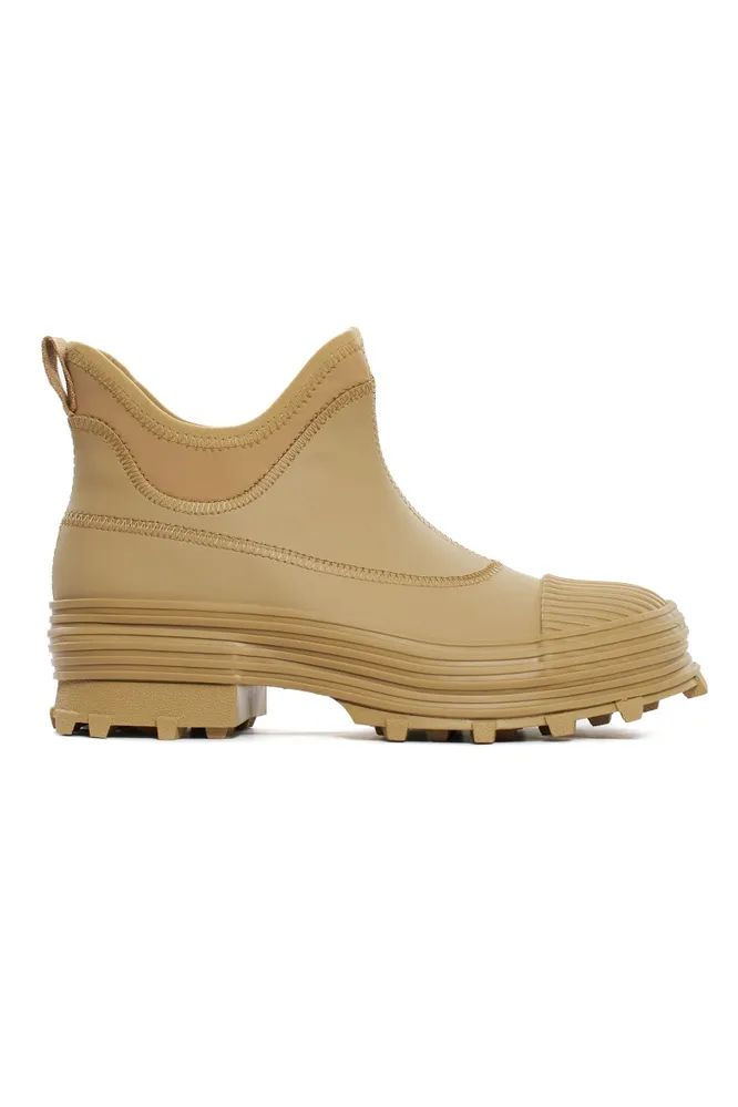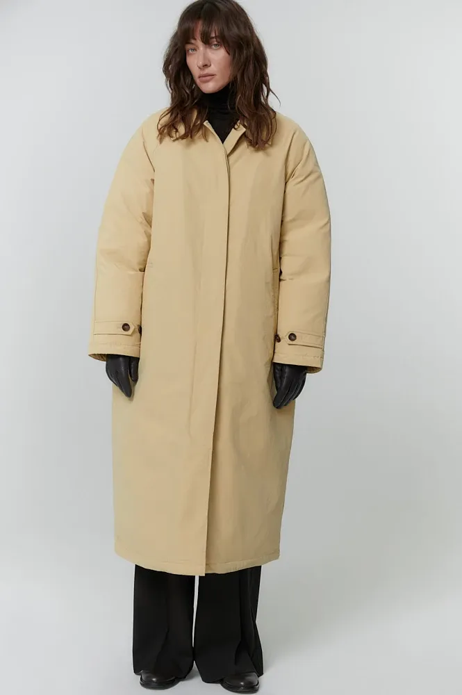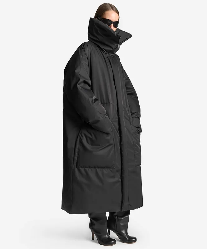 Хотя как проще – это с какой стороны посмотреть. Резиновые сабо на Ирине только кажутся обыкновенными, но в сочетании со стегаными брюками и расслабленным дутым пальто они дают прекрасный стильный микс.
