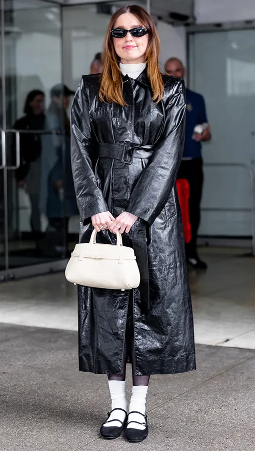 Приемов для удачной стилизации несколько: или замиксуй в образ белые вещи, как Эйми (футболка и носки отлично «балансируют» сумку), или собери образ в близких по тону теплых цветах, чтобы сумка на их фоне смотрелась контрастным акцентом.