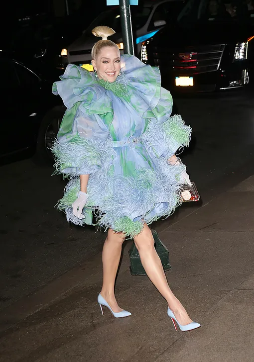 И вишенка на торте... В нашем случае это целый торт от Эрики Джейн. Кажется, общими усилиями с Наоми они могут сделать свадьбу Марка Джейкобса незабываемой. За таким количеством рюш очень сложно заметить певицу. Вместо привычной для торта кремовой начинки — зелёные перья. Наверное, Эрика репетирует следующий наряд для Met Gala, потому что это платье на свадьбе точно неуместно.