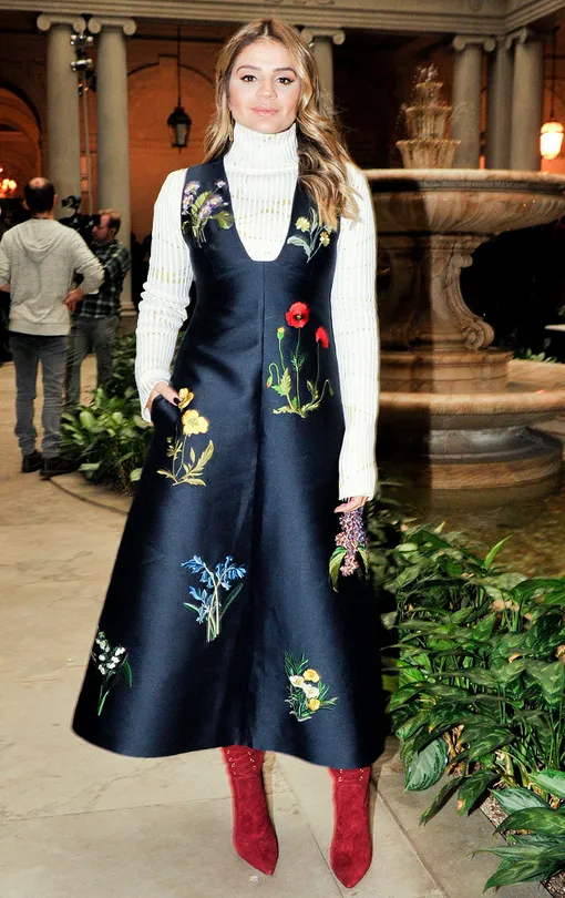 Эффектное темно-синее платье с ненавязчивым цветочным узором от Stella Mccartney приглянулось сразу двум знаменитостям. Супруга Брюса Уиллиса Эмма дополнила его классическими лодочками и темным клатчем, а Тасся Нэйвс решила «усложнить» образ, надев под платье водолазку и красные замшевые ботильоны.