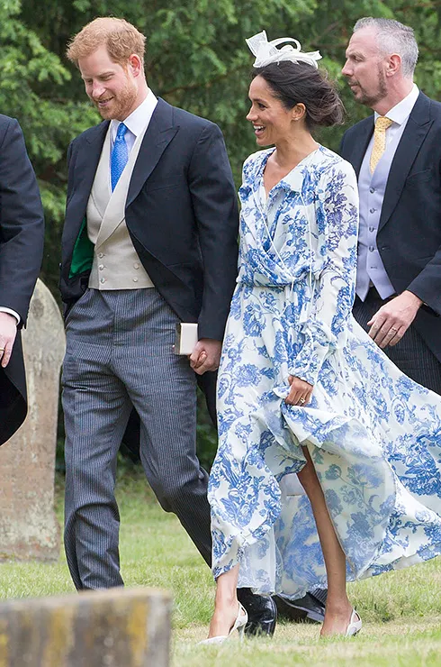 Почти сразу после собственной свадьбы Меган и Гарри посетили свадьбу друзей — герцогиня выбрала длинное платье с бело-голубым цветочным принтом и белые аксессуары. Несмотря на то что образ в целом получился довольно нежным, Меган не угадала с размером, из-за чего наряд полнил ее.