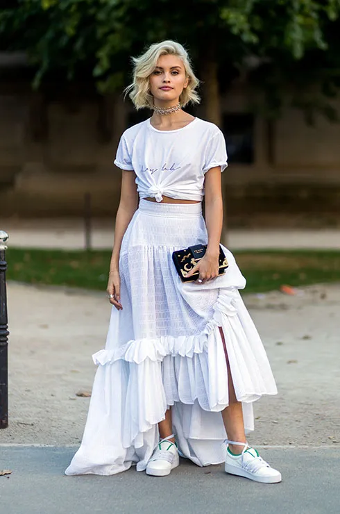 Пышные юбки в романтическом стиле с большим количеством ярусов и оборок в этом сезоне на пике тренда. И кто сказал, что носить такие юбки надо только с обувью на каблуке? Белые кроссовки в тон смотрятся ничуть не хуже. Уравновесит такое сочетание простая футболка с неброским принтом, завязанная на узел на талии.
