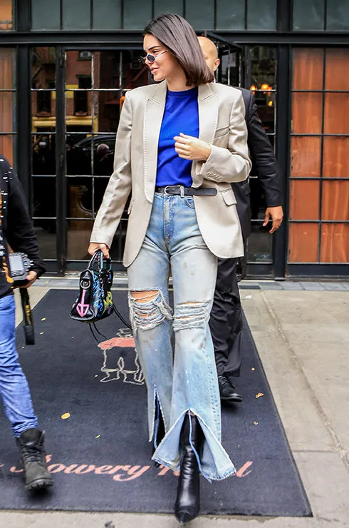Рваные джинсы смотрятся актуальными, если разрывы на них не единственная акцентная деталь. Как ориентир – эти расклешенные джинсы с разрезами на передней части. В первую очередь мы обращаем внимание на их силуэт. А еще важно, с чем мы сочетаем такие джинсы. Чтобы образ не был старомодным, лучше всего к джинсам добавить спокойные вещи, что называется, вне времени и один-два трендовых аксессуара, которые сделают ваш образ стильным.