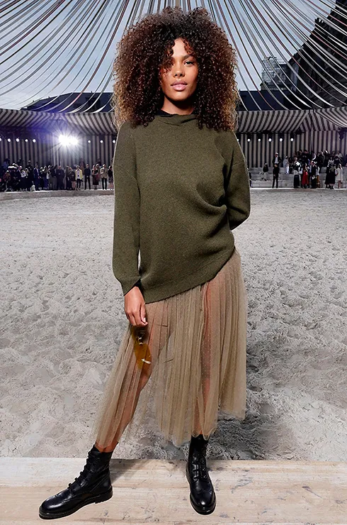 Плиссированная юбка плюс объемный свитер цвета хаки и грубые ботинки — смело бери этот осенний образ на заметку!
