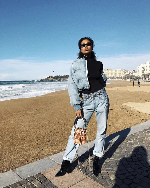 Денимовый total look отлично сочетается с черным свитером, такими же ботильонами и сумкой-акцентом.
