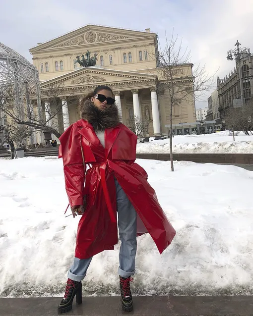 А в таком наряде Тина гуляла по Москве, которую посетила в марте этого года вместе с Касселем.