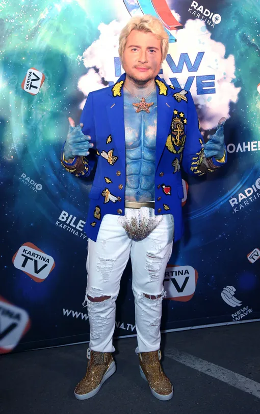 Но, конечно же, самый яркий (во всех смыслах этого слова) образ продемонстрировал Николай Басков — певец решила одеться в импровизированный костюм Владыки Морского, однако в последний момент не удержался и добавил в аутфит гламурные сникерсы в стразах.