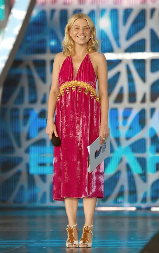 Ведущая конкурса Липа решила совместить в своем образе сразу два тренда — бархат и бельевой стиль, однако в результате платье девушки немного напоминало театральные портьеры.