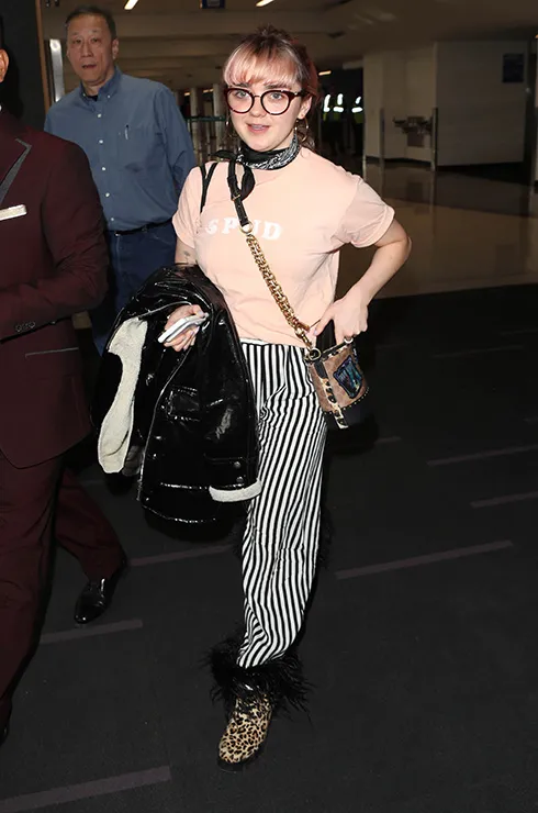 Мейси Уильямс выглядит весьма забавно в этих полосатых штанишках, украшенных по низу бахромой. Розовая футболка неплохо к ним подходит, а вот леопардовые ботинки кажутся в этом образе явно лишними.