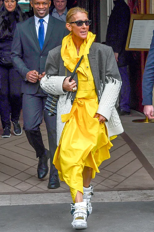 Селин Дион демонстрирует новый стиль не только на модных мероприятиях, но и в повседневной жизни. Ее новый образ, в котором она сочетает ярко-желтое платье, серый жакет и «уродливые» кроссовки уже попал во все обзоры модных критиков. А вам нравится это сочетание?
