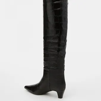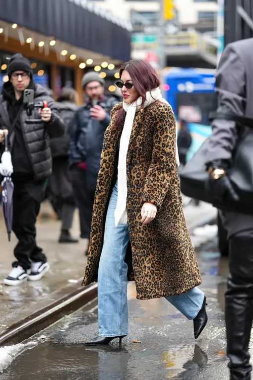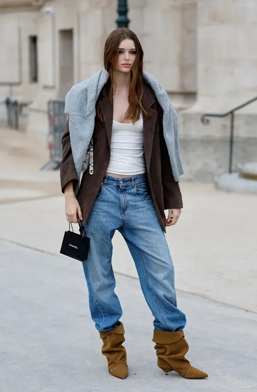 Так, замшевые сапоги с присборенным голенищем инфлюенсеры носят с синими джинсами багги, заправляя штанины в обувь, или эффектным меховым пальто с анималистичным принтом.