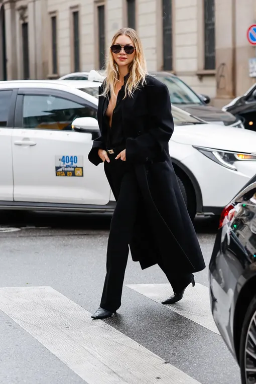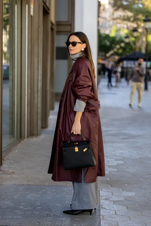 Более рафинированные образы модницы строят на классическом тотал-блэке или сочетании вневременных базовых вещей с трендовым акцентом, например, комбинируя серый свитер с воротом и кожаное пальто модного темно-винного оттенка.