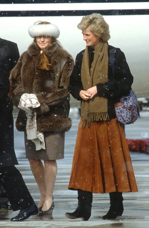 Ну а образ Дианы из 1988 года и вовсе будто только что сошел со страниц глянца: замшевая юбка миди, короткая черная куртка и коричневый шарф с бахромой - лук смотрится абсолютно актуально и сейчас.