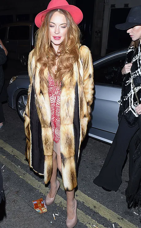 Увидев этот образ Линдси, мы буквально потеряли дар речи: шуба дочери охотника, жутковатое кружевное красное платье и «нюдовые» туфли-«копытца»... Угадай, какого года этот аутфит? Не поверишь — 2015-го!