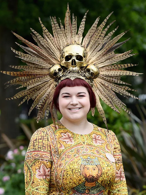 Золотые черепа и принт в виде фресок — в неоригинальности эту даму сложно упрекнуть.