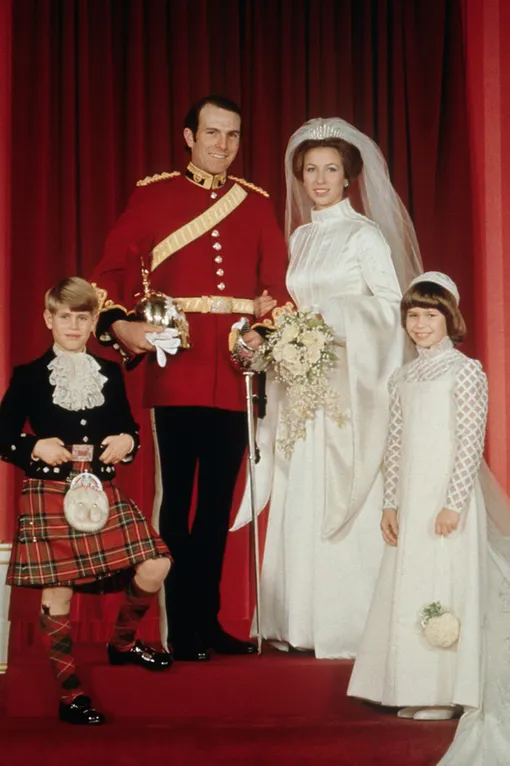 Принцесса Анна для своей церемонии выбрала платье Морин Бейкер. Конечно, удобство и комфорт в самый главный день жизни очень важны, но это не повод надевать на свадьбу свитер. Горло-стойка и максимально закрытый верх как будто повторяют военную форму Марка Филлипса, а расклешенные рукава напоминают форму священнослужителя. Надеемся, участники мероприятия не расстроились, что пришли в одном и том же.