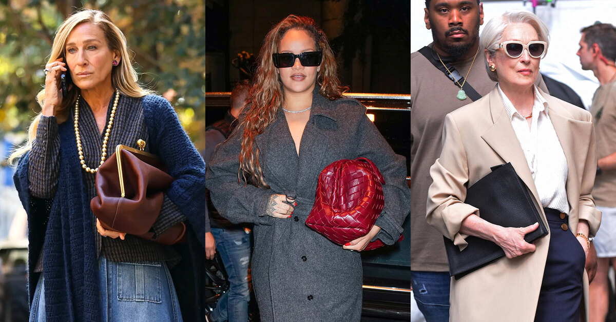 Просматриваться этот тренд начал еще в прошлом сезоне, когда Рианна появилась на публике с бордовым клатчем Bottega Veneta, а Сара Джессика Паркер на съемка «И просто так» — с гигантским ридикюлем Coach.
