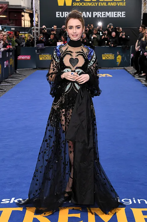 Лили Коллинз – ее платье напоминает наряд для костюмированной драмы. Такое могла бы носить какая-то экстравагантная принцесса в экранизации фэнтези или чего-то подобного. Прозрачная юбка в горох и аппликация в виде рук, держащих сердце, вместе кажутся символичными и даже несколько зловещими.