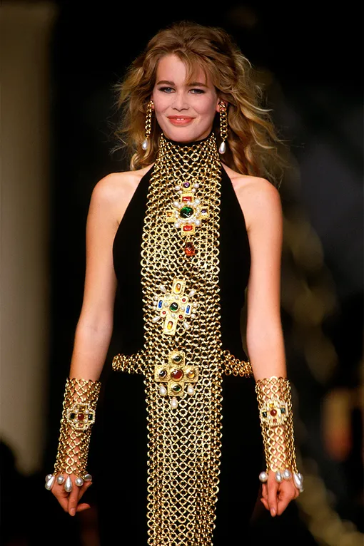 Это один из первых показов мод, в котором приняла участие Клаудия Шиффер — демонстрация коллекции прет-а-порте Chanel 1990 года. Ей было 20 лет. Юная модель появилась на подиуме в черном облегающем платье с американской проймой и декоративной золотой кольчугой.