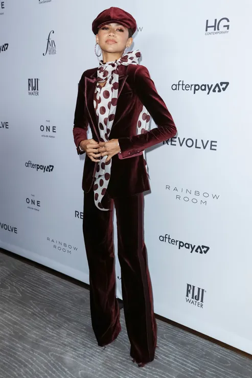 Зендайя появилась на Нью-Йоркской неделе моды в роскошном брючном костюме из темно-вишневого бархата. Отличным дополнением к нему стала блузка в крупный горох с широким шарфом, завязывающимся на бант. В сочетании с беретом и крупными украшениями вышел очень французский по духу комплект.