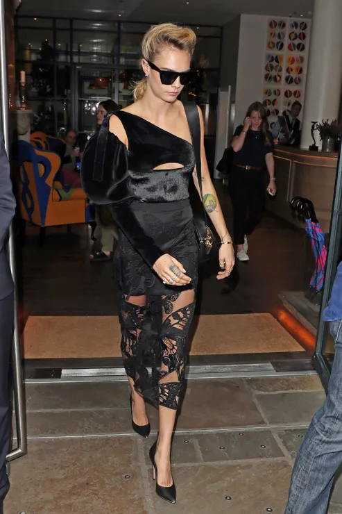 Кара Дельвинь любит сложные наряды. На этой неделе мы увидели ее в узком платье из черного бархата с асимметричным декольте и пышным рукавом жиго. Поверх этого короткого платья девушка надела узкую юбку-миди из черного тюля с крупными фактурными бабочками.