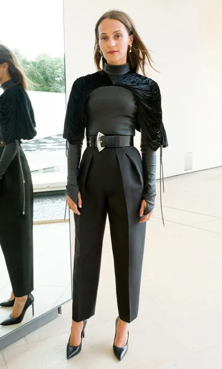 Алисия Викандер на этой неделе засветилась в сложном комплекте черного цвета. Богатое сочетание различных фактур (кожа, шерсть, трикотаж, бархат) хорошо сочеталось со структурой и силуэтом наряда. Тяжелая пелерина из бархата, подчеркивающая плечи, в паре с широким поясом на талии сделала актрису похожей на воительницу из фантастической саги. Но благодаря тому, что весь наряд благородного черного цвета, образ не скатился в костюмированность, а получился очень уместным и элегантным.