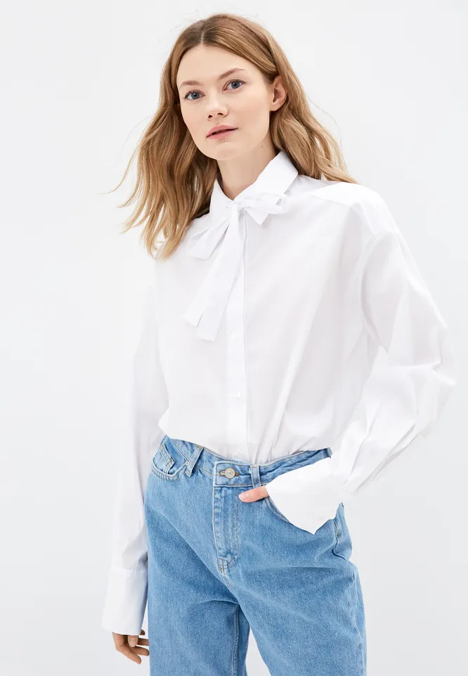Добавить будничному образу романтичности поможет модная белая рубашка с бантом. Мы подобрали для тебя модель с небольшим бантом на воротнике и чуть удлиненными рукавами, которые добавят аутфиту легкую небрежность. Рубашка одинаково хорошо смотрится и с атласными юбками в бельевом стиле, и с джинсами, и с кожаными штанами, и с классическими брюками.