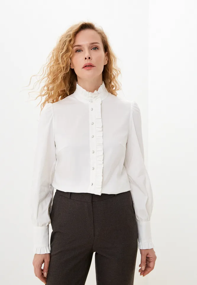 Модная белая женская рубашка в романтическом стиле с воротником-стойкой – отличный способ разнообразить не только повседневный, но и деловой гардероб. Как носить такую белую рубашку? Например, ее можно замиксовать с широкими брюками с высокой посадкой из лоснящейся ткани и кожаными ботильонами на каблуке-рюмочке.