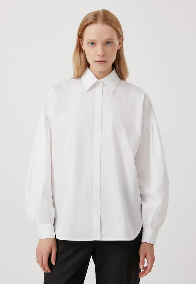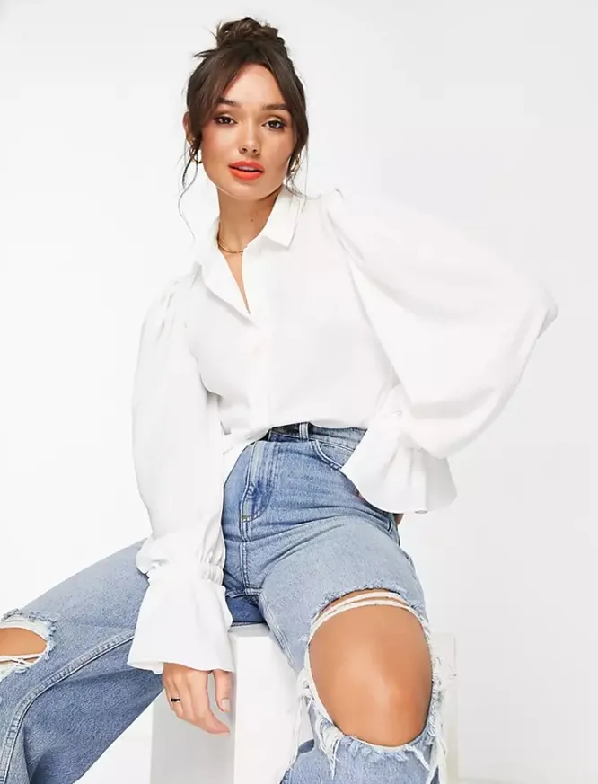 Если хочешь добавить образу динамичности и выразительности, выбирай модную белую рубашку — 2022 с объемными рукавами. Она преобразит деловой образ с классическими черными брюками, а также станет отличной основой для будничных casual-луков. Например, ты можешь замикосвать ее с кожаными брюками и высокими грубыми ботинками на шнуровке.