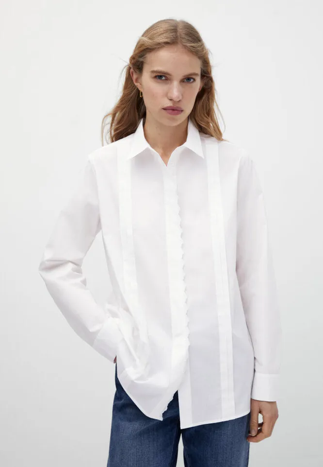 Если любишь классические вещи с необычным декором, советуем купить модную белую женскую рубашку из поплина с ненавязчивыми воланами. Она легко впишется как в деловые, так и в повседневные аутфиты. В первом случае предлагаем носить ее с брюками-сигаретами, удлиненным приталенным блейзером и остроносыми ботильонами на каблуке. Во втором – с джинсами-трубами и замшевыми казаками.