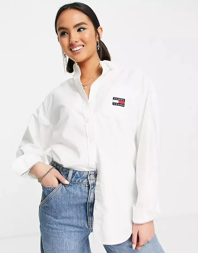 Модная белая женская рубашка стильно смотрится с расслабленными широкими джинсами и городскими кроссовками на массивной подошве. Заверши лук небольшой сумкой и парой акцентных украшений.