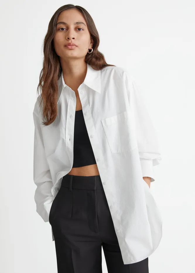 Еще одна модная белая рубашка — 2022: модель кроя оверсайз. Обрати внимание на этурубашку. Она выполнена из плотного структурированного хлопка, поэтому можно носить ее как соло, так и надевать поверх топов, водолазок, бралеттов. Объемную рубашку можно сбалансировать узкими брюками или джинсами. Удлиненные модели предлагаем носить с плотными черными легинсами и жокейскими сапогами.